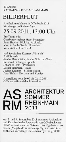 Am 3. und 4. September 2011 zeichnen Architekten und Kreative in der Innenstadt von Offenbach eine „Flut” variantenreicher Skizzen. Das Ergebnis ist zu einem „Megabild” zusammengefügt und wird in der festlichen Vernissage im Rathausfoyer vorgestellt.